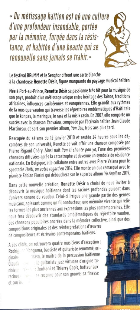 April 1, 2026 April 1, 2026 Jeudi 16.04 | 20:00 Renette Désir le soufle d’Haiti By: Placide Antoine Placide Antoine Concerts Leave a comment on Jeudi 16.04 | 20:00 Renette Désir le soufle d’Haiti “Du métissage Haïtien est né une culture d’un profodeur insondable, portée par la mémoir forgé dans la résistance, et habité d’une beauté qui se renouvelle sans jamais se trahir” Lire la suite